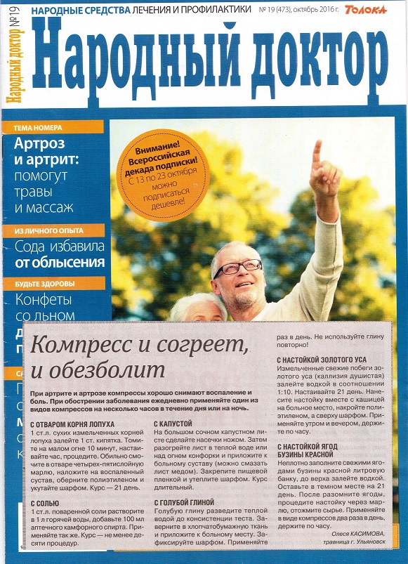 КОМПРЕССЫ ПРИ АРТРИТЕ (НАШИ ЗАМЕТКИ НА СТРАНИЦАХ НАРОДНОГО ДОКТОРА №19 2016)
